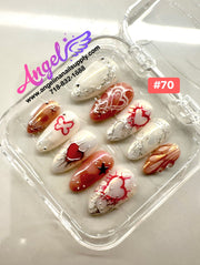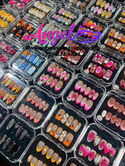 Explore our exclusive collection of handmade press-on nails, crafted with precision and creativity. Every set features stunning, unique designs—from delicate florals and chic marble patterns to bold charms, ombré gradients, glitter accents, fruit themes, holiday looks, and more.