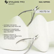Professional cuticle nippers designed for precision and comfort. The SMART 70 offers sharp, hand-sharpened 14 mm blades for smooth, clean cuts without tearing. Ergonomic handles ensure excellent balance and reduced hand fatigue during long salon sessions.